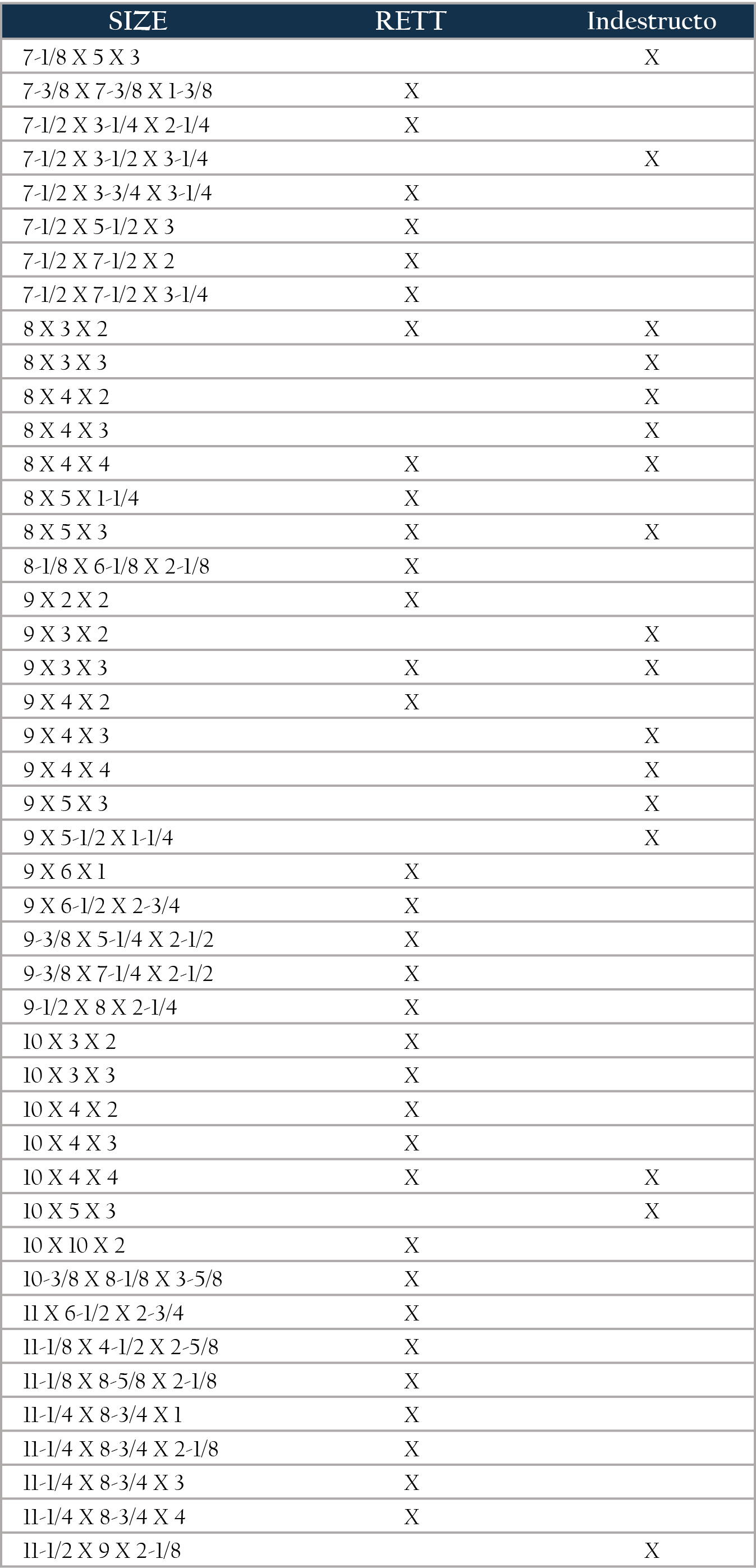 Stock Sizes Listed By Length - Available Style is Marked