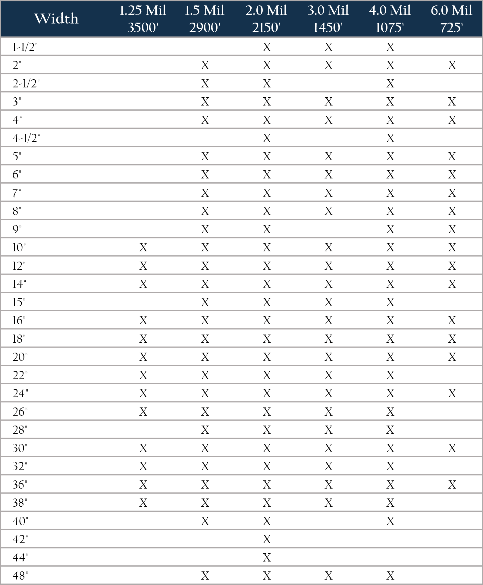 Stock Sizes Listed By Width - Available Thicknesses and Color are Marked